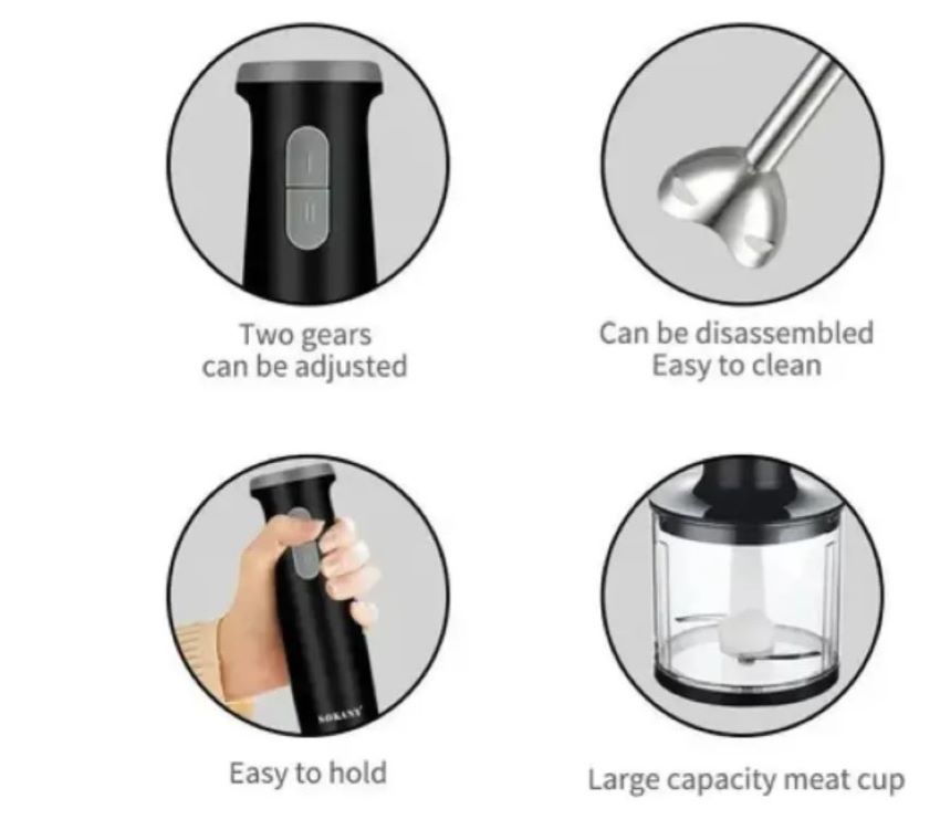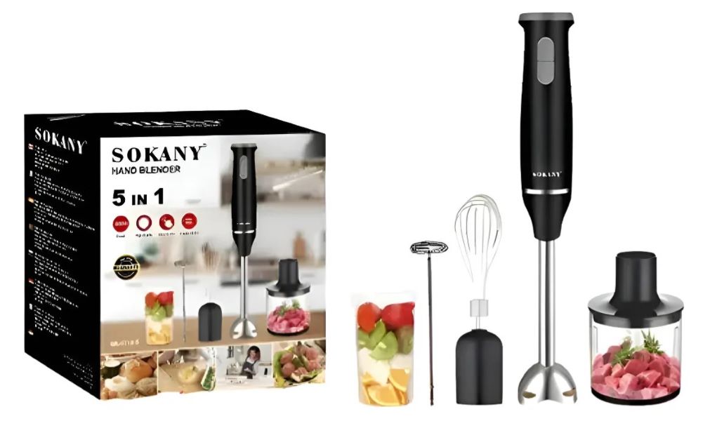 – Esta es una batidora de mano Sokany 5 en 1 (modelo SK-1714-5), disfrutarás de una batidora potente, práctica y confiable que agilizará tus preparaciones. Su diseño elegante en acero inoxidable aporta un toque moderno a tu cocina, mientras que su rendimiento profesional asegura resultados siempre consistentes.