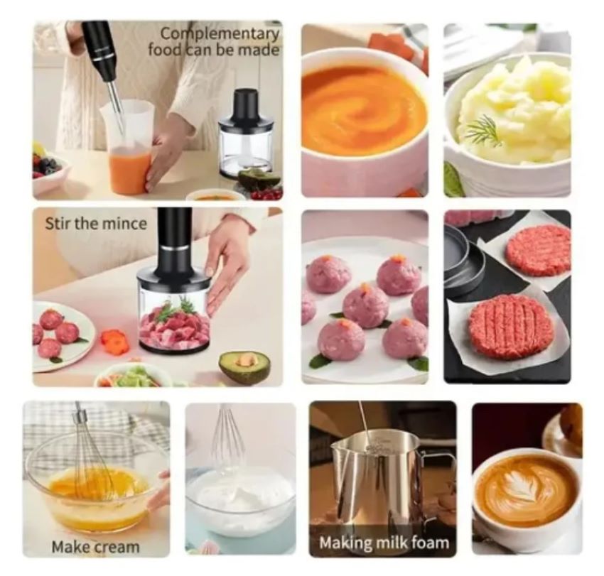 * Incluye múltiples accesorios para picar, batir huevos y mezclar.