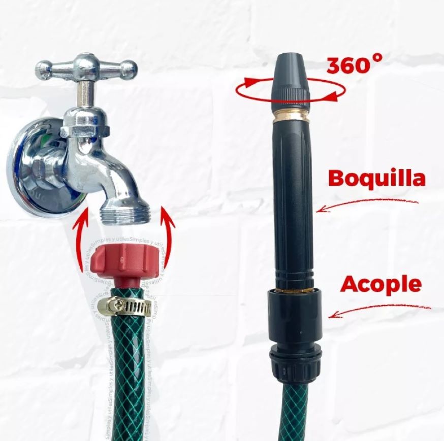 – Modo de uso: Simplemente, conecta la boquilla a tu manguera estándar. Su Versatilidad: Dispone de múltiples modos de agua para satisfacer todas tus necesidades de limpieza y riego. La boquilla está hecha de un material de alta calidad que es resistente al óxido, lo que garantiza su durabilidad.