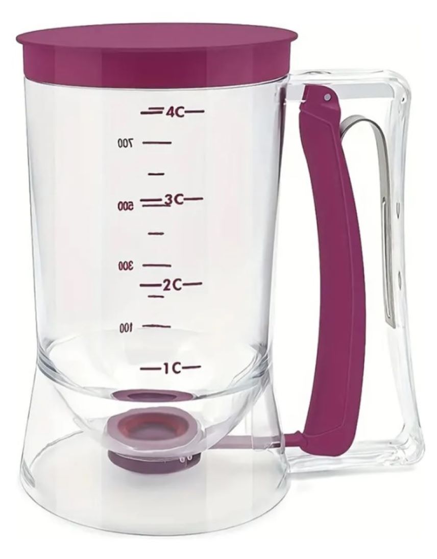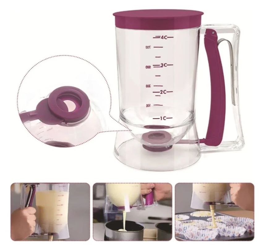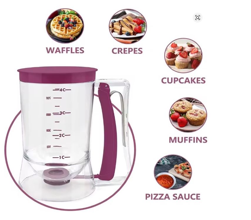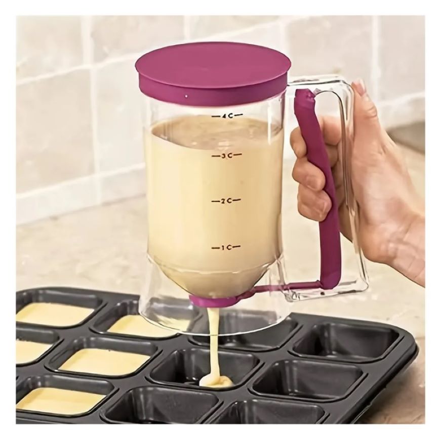– Control de porción exacto Facilita la creación de tortitas y muffins uniformes, eliminando el desorden en la cocina. Versatilidad de uso :Ideal para panqueques, magdalenas, crepes, muffins, cupcakes y más. Diseño sin derrames con válvula de cierre rápido previene fugas, manteniendo la cocina limpia y segura para niños.
