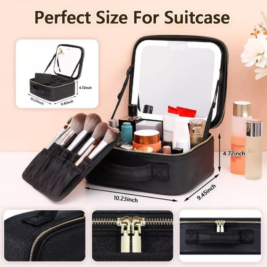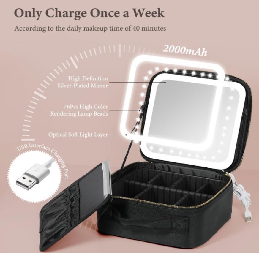 – Espejo inteligente con iluminación LED de 3 modos: el estuche de cosméticos incluye un espejo de luz de pantalla completa de 7.9 x 6.7 pulgadas. Pulsa el interruptor para ajustar el brillo de la luz del 0% al 100%, y tocar suavemente el interruptor puede ajustar fácilmente la temperatura de color entre luz fría, luz natural y luz cálida, haciendo que tu cara refleje la condición de la piel y los detalles faciales.