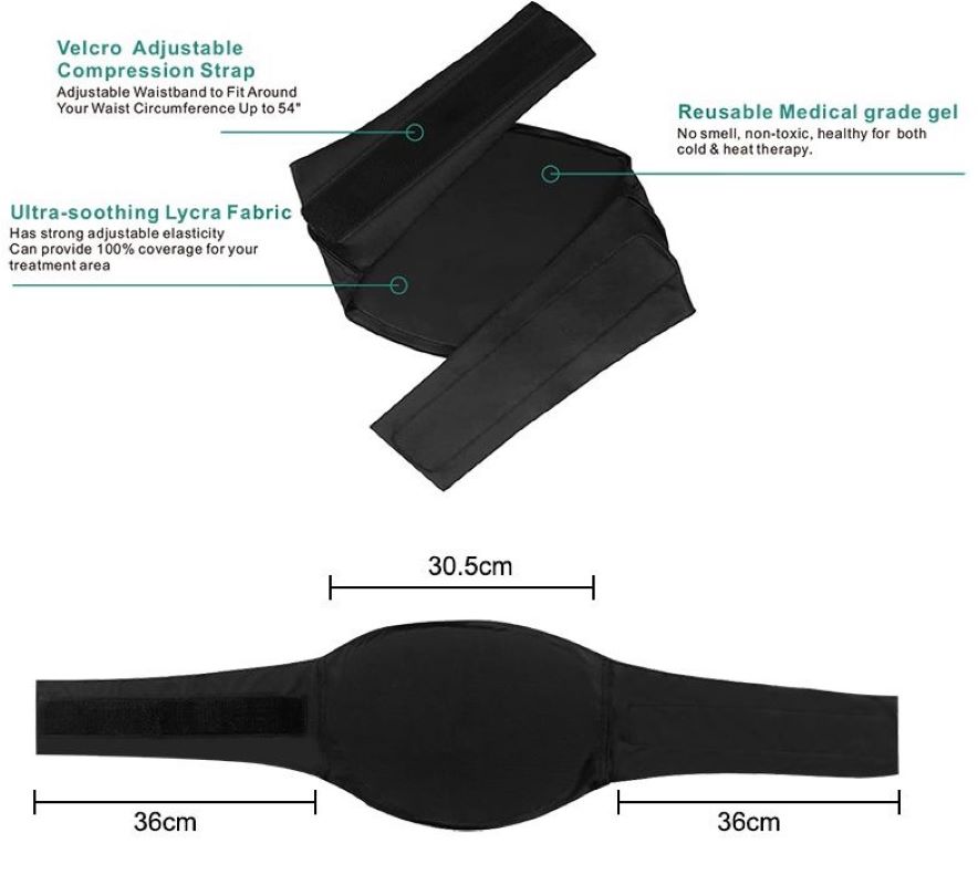 – Alivio eficaz del dolor de espalda, abdomen o cadera. La venda de terapia de frío y calor ofrece un manejo versátil del dolor. Su compresa de gel flexible garantiza un alivio localizado del dolor muscular, la inflamación y la recuperación de lesiones.