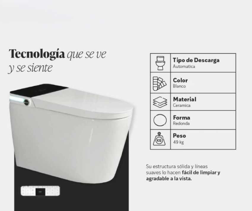 – Es la síntesis perfecta de confort de lujo, tecnología de punta y diseño superior. Eleva tu Baño a una Experiencia de Lujo y Confort Cada función de este sanitario inteligente está diseñada para ofrecerte una comodidad superior y una higiene impecable. Configure desde el control remoto, puesto sobre la base fija justo al lado del inodoro, y active con facilidad los modos de limpieza; un chorro de agua a la temperatura y presión perfectas que yo mismo puedo configurar.