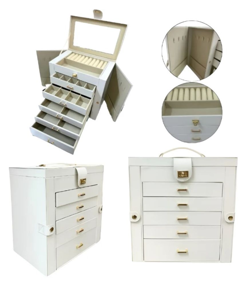 * 5 cajones para anillos, aretes, collares, pulseras.