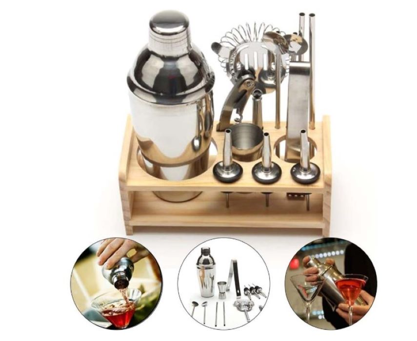 – Un kit coctelero, tapones con dispensador, un exprimidor, posavasos, copas de profesional… Utensilios de coctelería para hacer cocktails en casa o donde desees