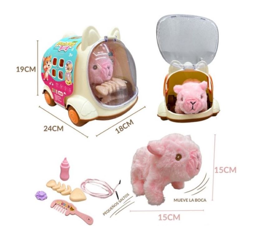 * Mascota interactiva agradable al tacto, puede hacer sonidos, menear la cola y caminar.