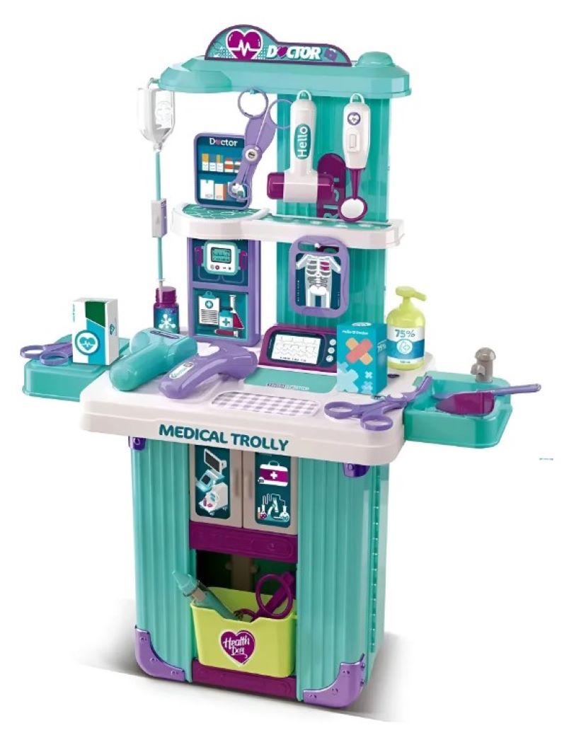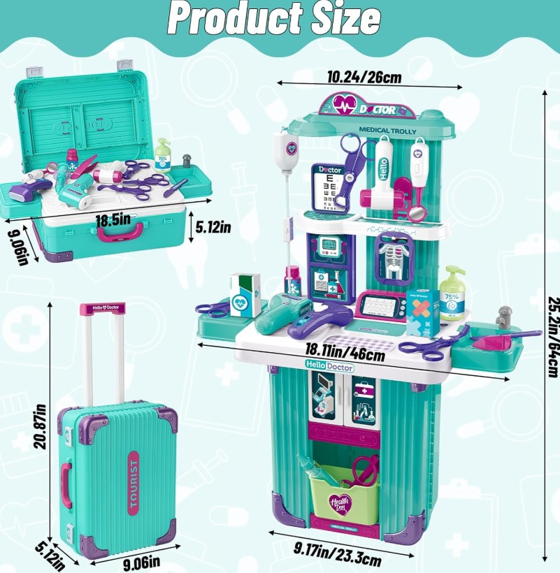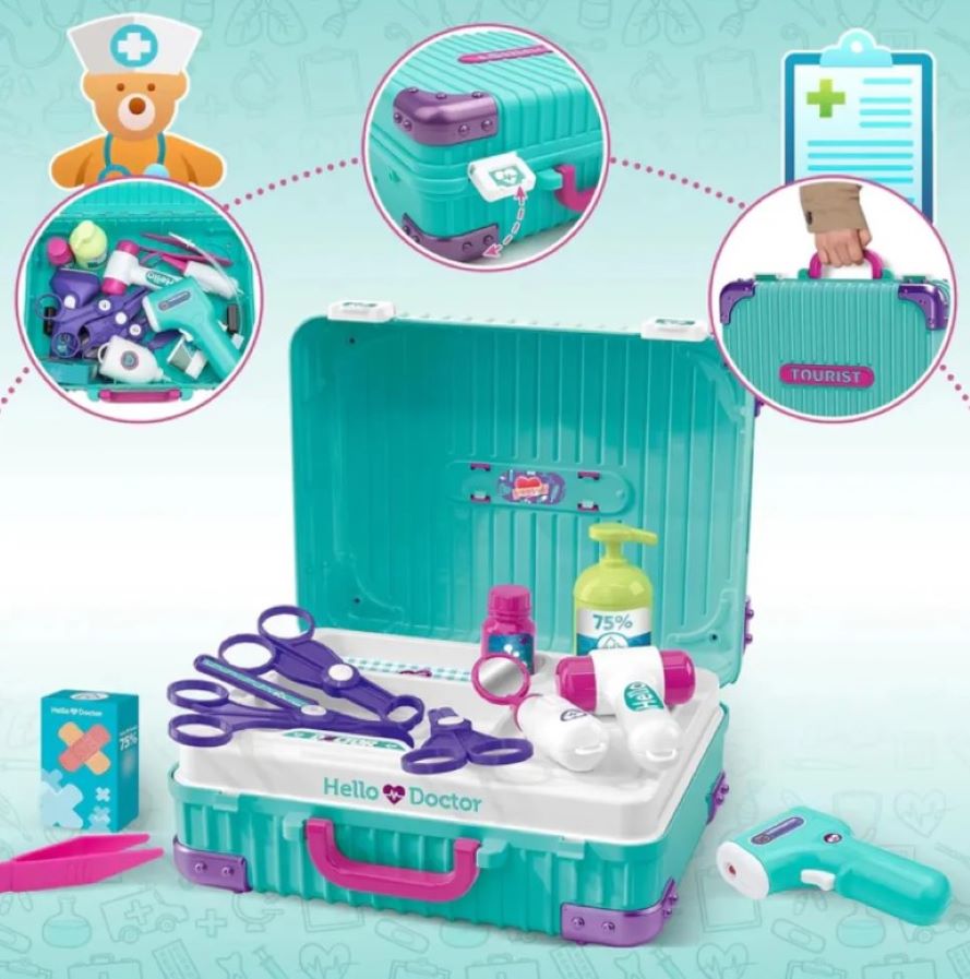 – El set incluye varios accesorios médicos de juguete. El carrito se pliega en una maleta de color turquesa con ruedas para facilitar su transporte. Con un tamaño adecuado para que el niño pueda manipular fácilmente.