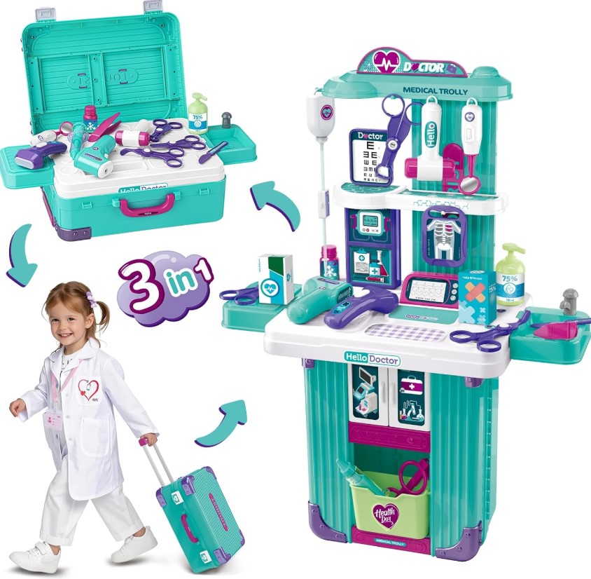 * Diseño 2 en 1: Se transforma fácilmente de maleta con ruedas a una completa estación médica de juego.