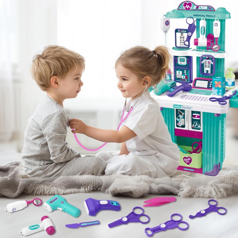 * Incluye más de 20 accesorios: Estetoscopio, termómetro, jeringa, tijeras, frascos de medicina, rayos X, monitor y más.