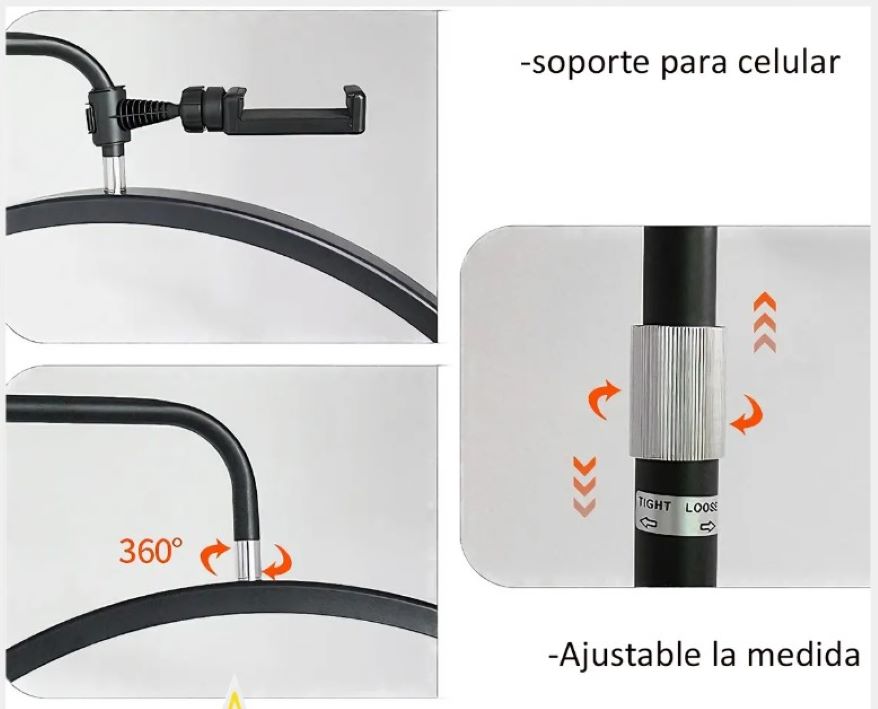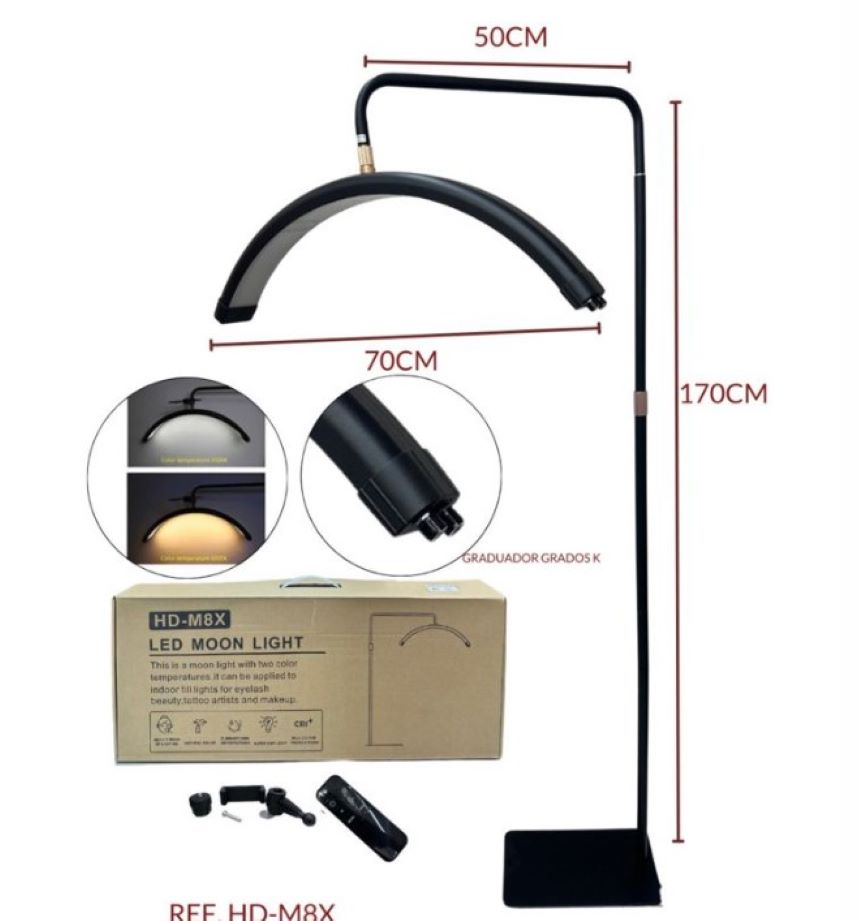 – Aro De Luz LED Media Luna Luz Blanca/Amarilla/Cálida + Soporte Para Celular. Tiene varios niveles de intensidad, la luz cambiará significativamente en cada nivel. Hace imágenes mucho más nítidas y detalladas. Tiene luz cálida y luz fría, las cuales se pueden combinar para variar el tipo de iluminación.
