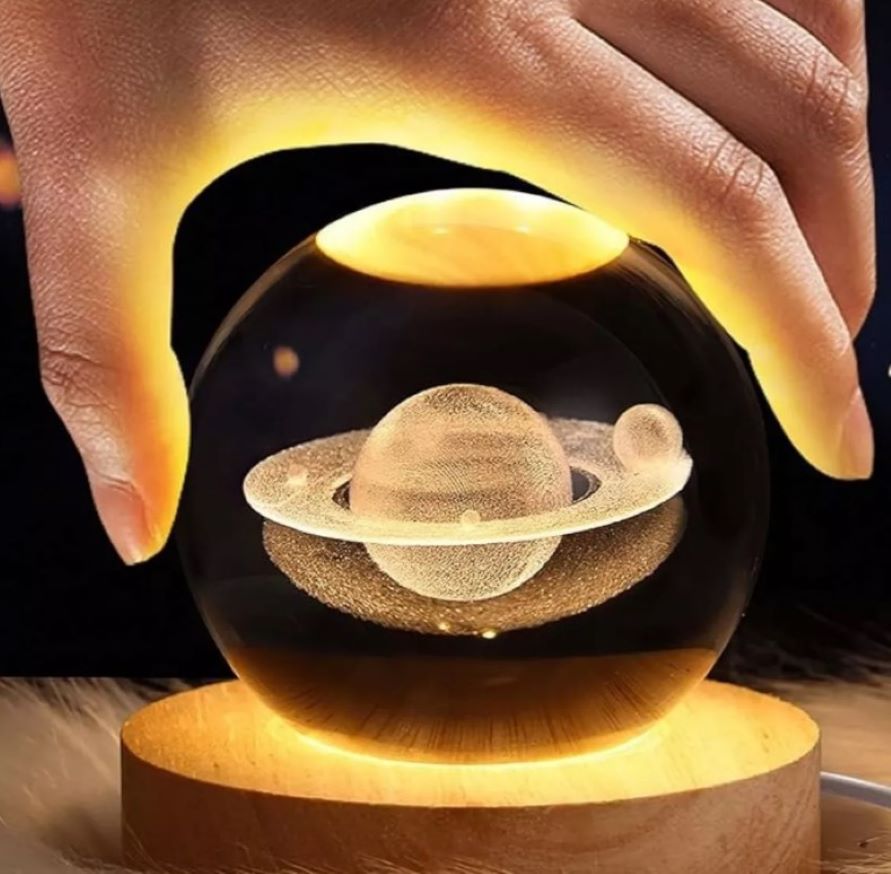 Lampara Nocturna 3d Bola De Cristal Saturno Con Base Madera.