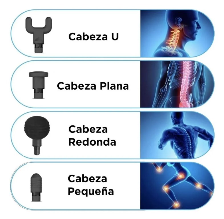 – Este masajeador está equipado con cuatro cabezales de masaje de diferentes formas para ayudar al usuario a relajar diferentes partes del cuerpo y 6 velocidades variables. La cabeza de masaje de la horquilla está diseñada para la columna vertebral; Plana, para cualquier parte del cuerpo; bullet one, para las articulaciones; Redonda, para grupos musculares grandes; el usuario puede cambiar la velocidad de la pistola de masaje según sea necesario.