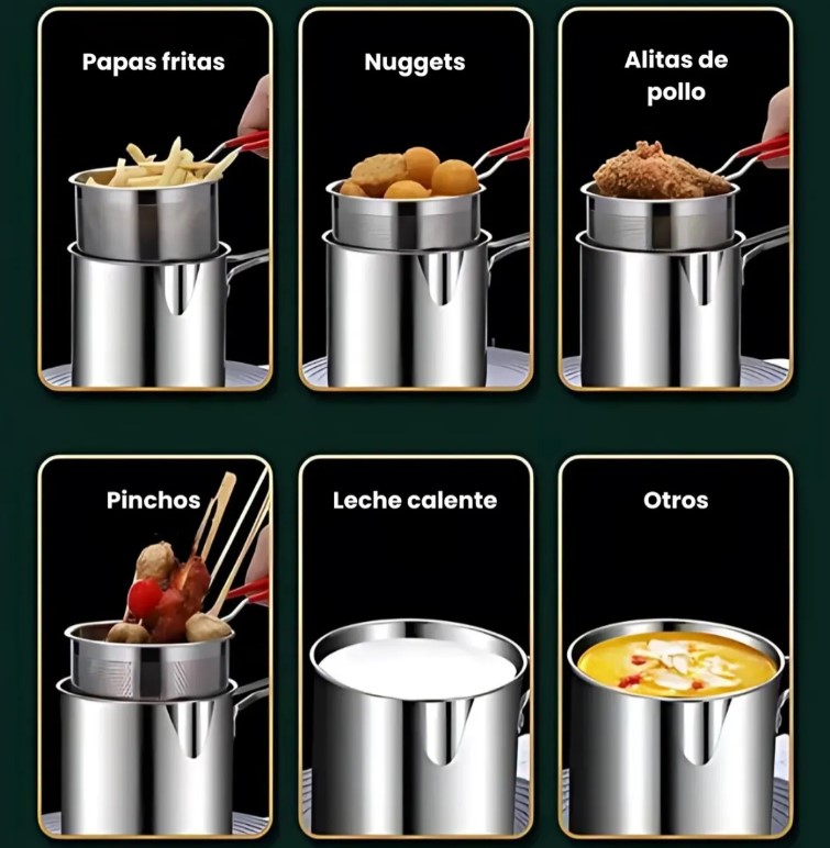 – Fabricada en acero inoxidable, este producto no solo es duradero, sino que también es fácil de limpiar, lo que lo convierte en una opción práctica para la cocina diaria. Su sistema de cocción a base de aceite asegura que los alimentos se cocinen de manera uniforme, mientras que la cesta coladora facilita el escurrido y la manipulación de los alimentos fritos.