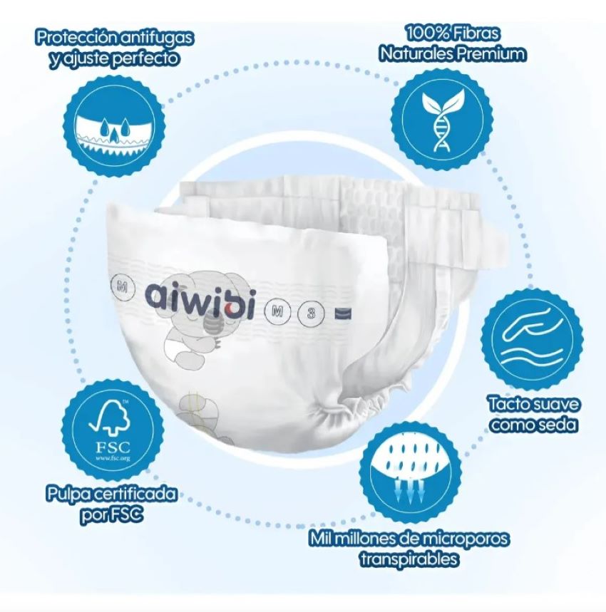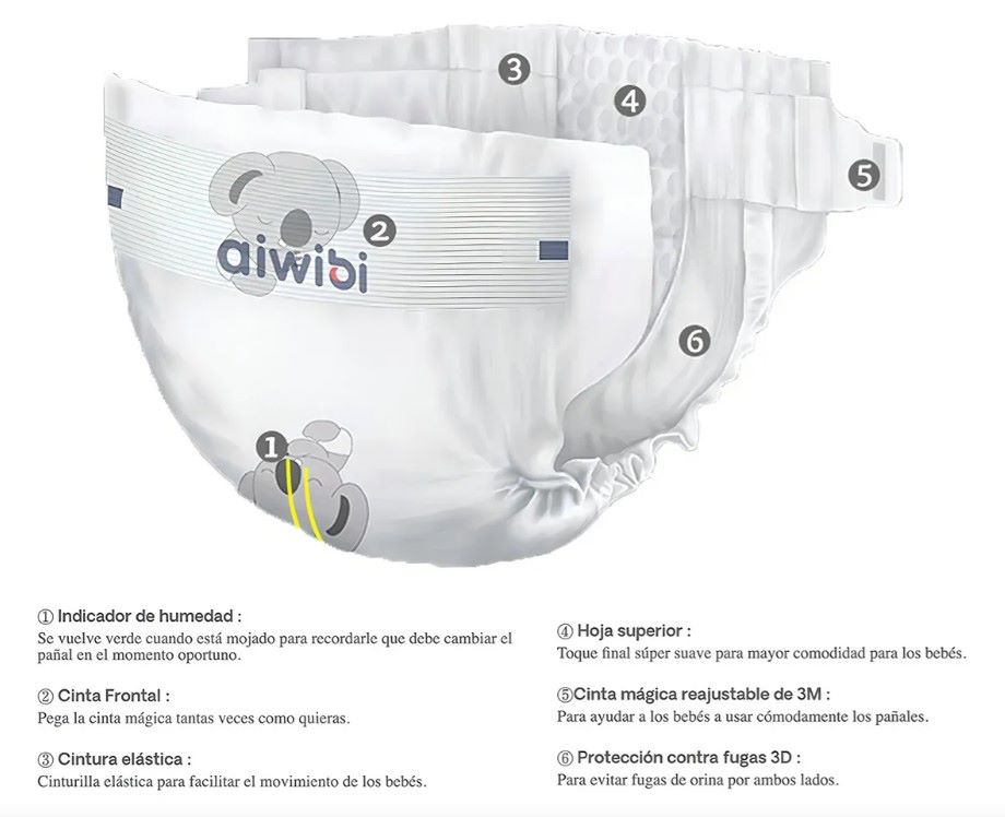 – Los pañales Aiwibi Premium son ultrasuaves y cuentan con microporos transpirables para la circulación de aire, reduciendo el riesgo de irritaciones o erupciones en la piel del bebé. Poseen protección 3D antifugas laterales, con velcro 3M repetible, elástico y flexible para un ajuste firme alrededor de la cintura del bebé.