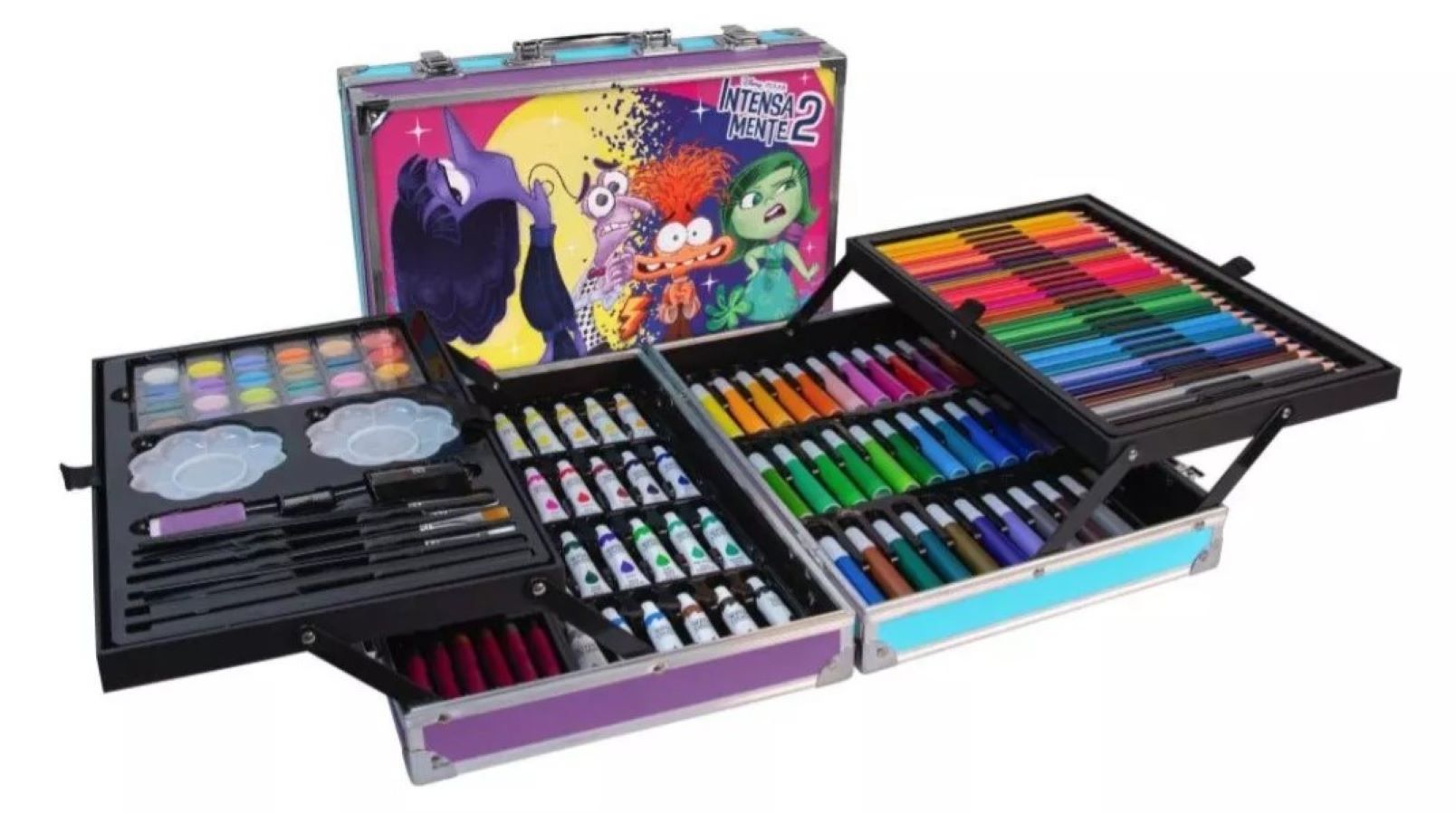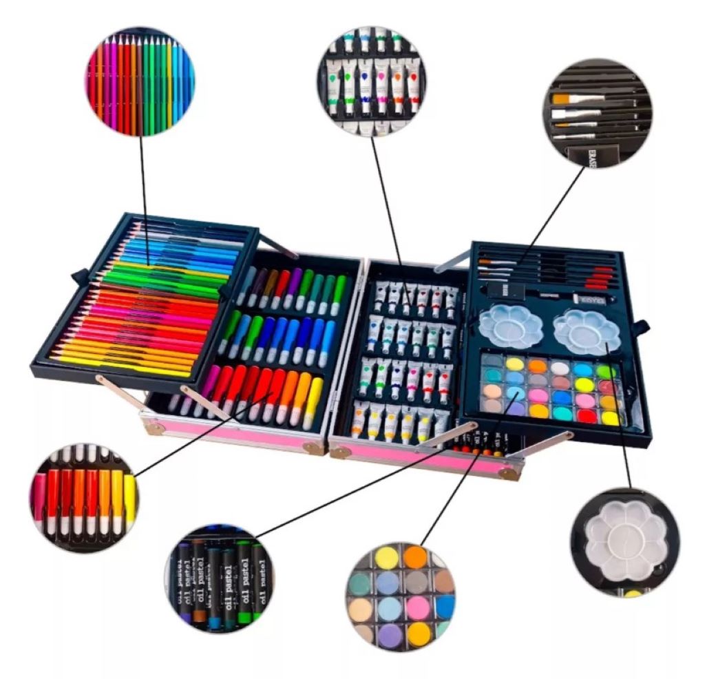 – Ayuda a desarrollar la creatividad, imaginación y habilidades de tu hijo con este set de arte. Su diseño en forma de maletín lo hace ideal para llevarlo a todos lados. El set incluye 145 artículos, desde pinturas al óleo y lápices hasta pinceles donde cada objeto tiene su propio lugar. Además, está fabricado con materiales resistentes y ligeros, con asa para el transporte y cierres de seguridad.