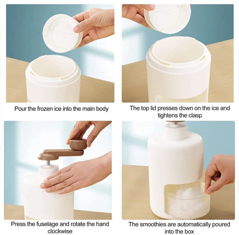 – Esta máquina trituradora de hielo manual es fácil de usar: poner en cubitos de hielo, girar el mango y ver cómo el hielo triturado cae en el tazón, y solo tarda un minuto en hacer conos de nieve a partir de ahora.